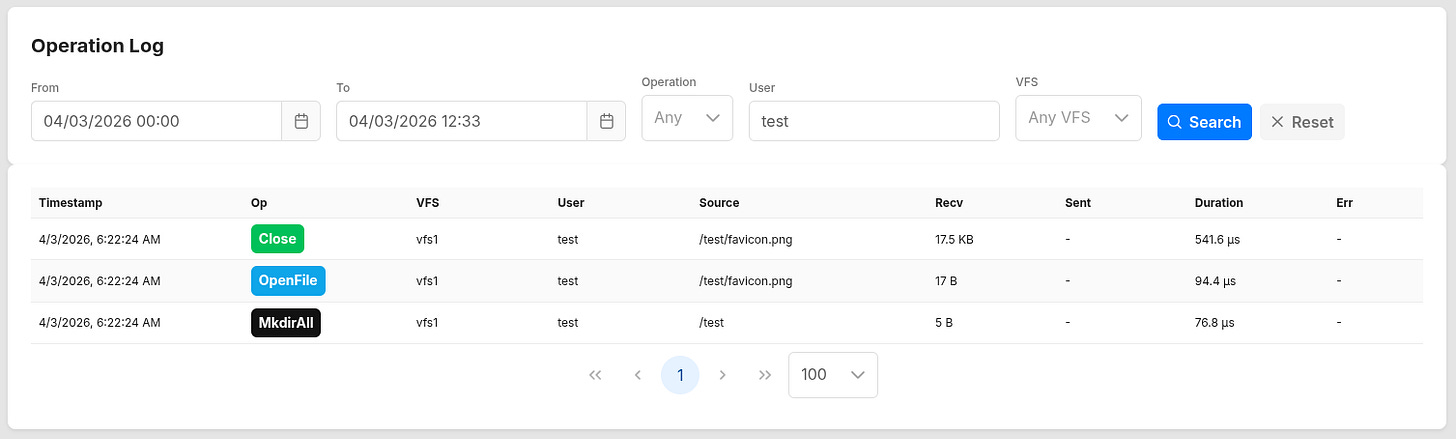 Every file operation is recorded with timestamp, operation type, VFS, user, path(s), bytes received and sent, duration, and error status. You can filter by time range, operation, user, VFS, or any combination thereof. Precisely the kind of granular, on-demand visibility that system administrators have always wanted when something needs investigating.