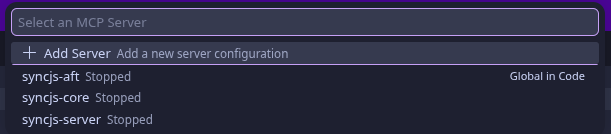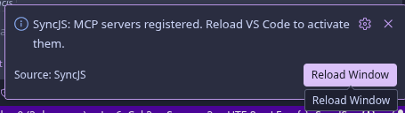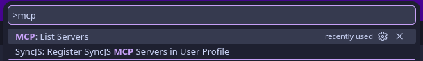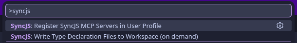 Once installed, open the command palette with Shift+Ctrl+P and run: SyncJS: Register SyncJS MCP Servers in User Profile.