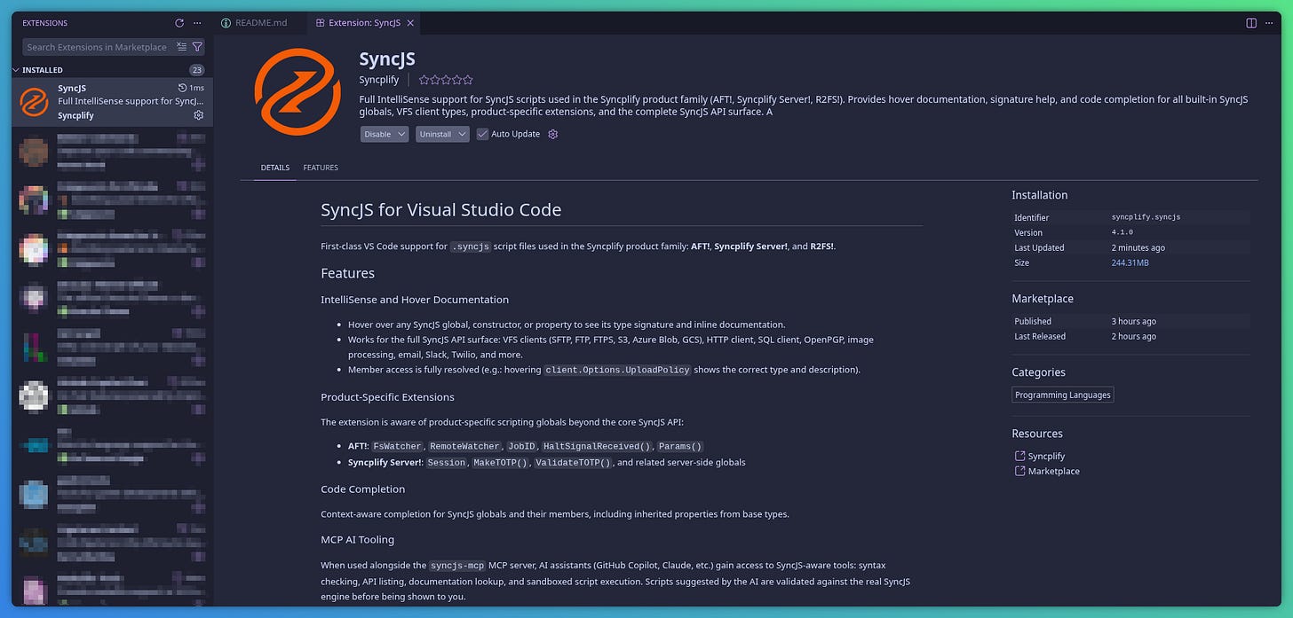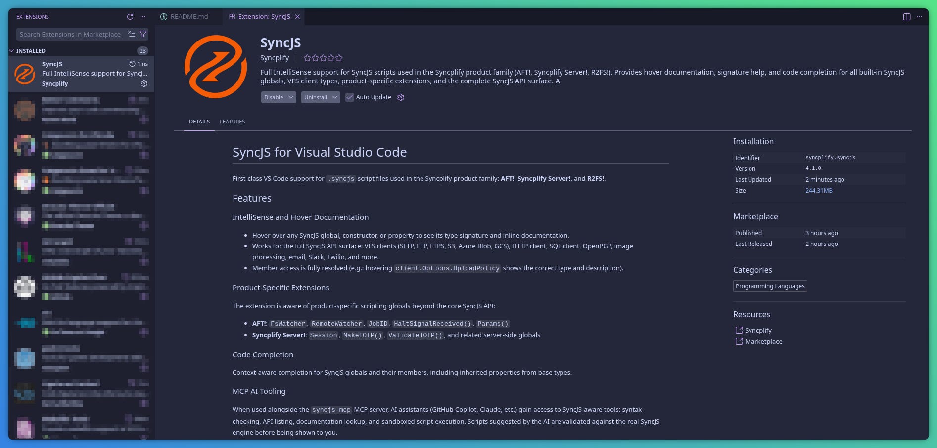 As SyncJS continues to expand across the Syncplify product family, now shipping in Syncplify Server! v7.1 and R2FS! v2.0, and arriving soon in its enhanced form in AFT! v4.0, one thing became clear: our customers needed proper tooling for the editors they already use.