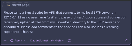 That’s it. Your AI agent now has precise, complete knowledge of the SyncJS language: its syntax, object model, and the full functional API. Write your prompt as you normally would.