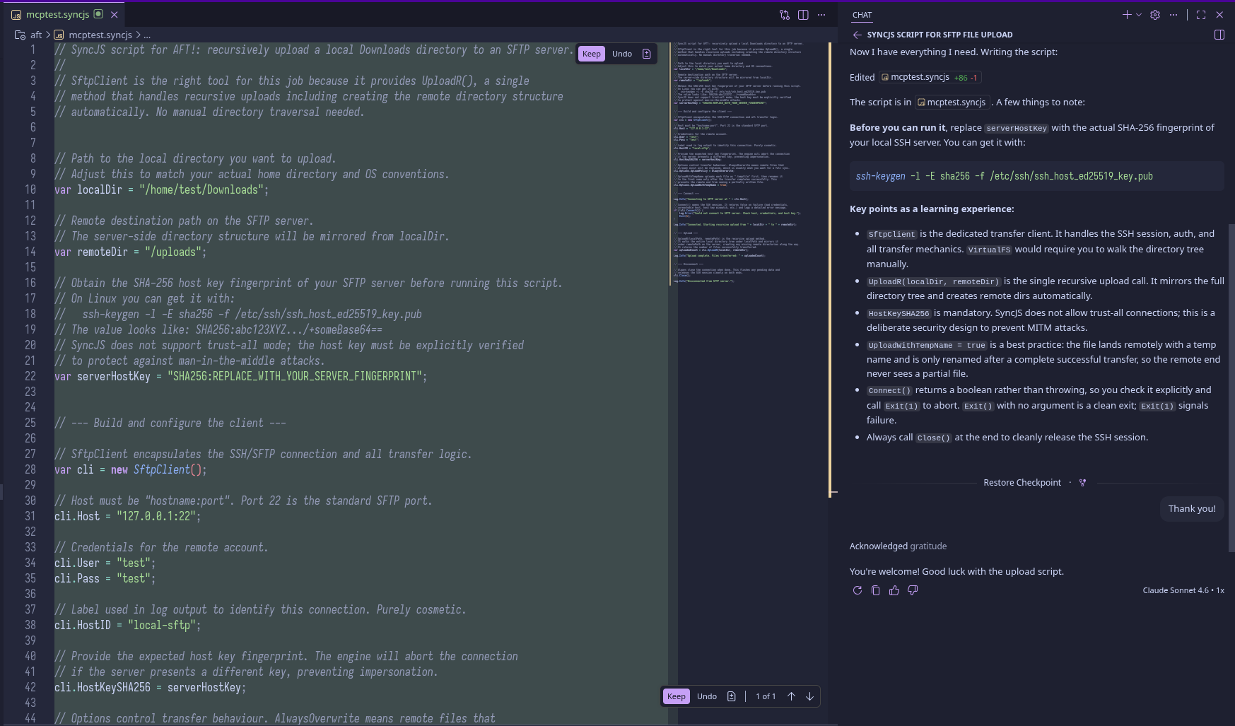 The agent produces a working SyncJS script. Review it, make any adjustments you want, then paste it directly into your Syncplify product’s web UI.