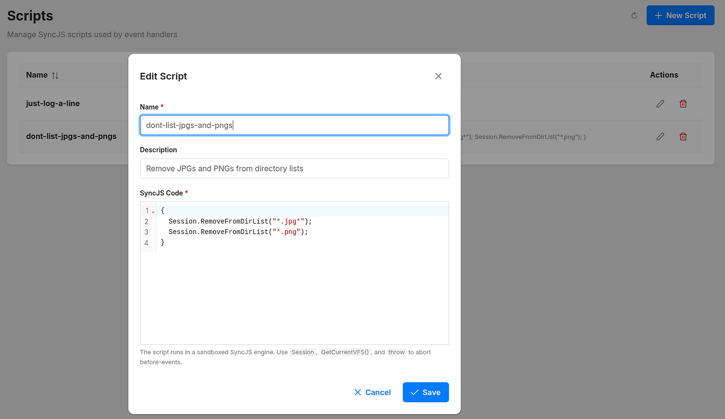 If you’ve built automation workflows on Syncplify Server!, you already know how powerful SyncJS can be. Event hooks, deep per-session control, file-system ops, HTTP/S calls, database connectivity, message queues, PGP encryption, and more… all scriptable in Syncplify’s very own extended JavaScript flavor, and portable across your entire deployment. That scripting and event handling subsystem is one of the most distinctive and beloved features of Syncplify Server!, and we’ve heard loud and clear that R2FS! users want it too.