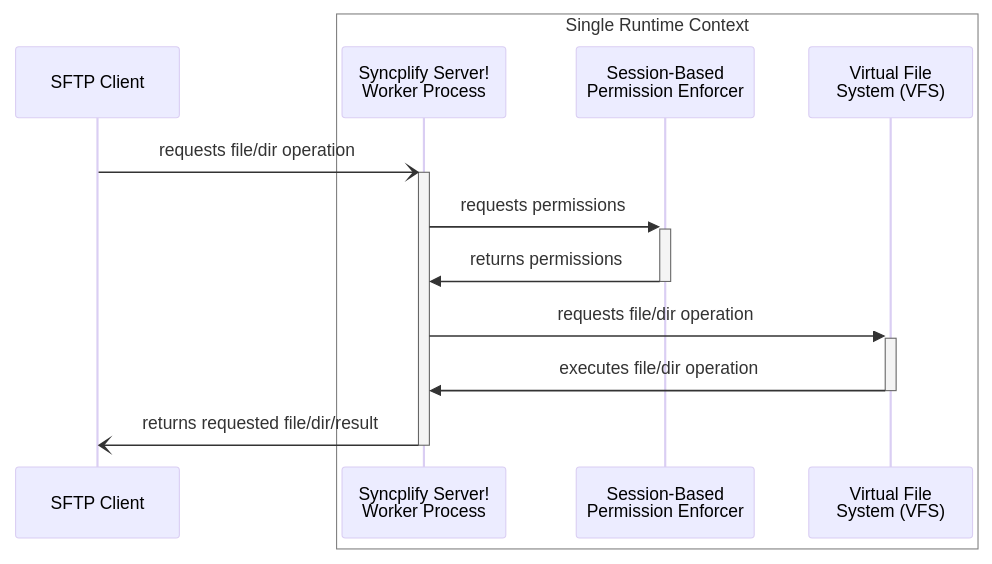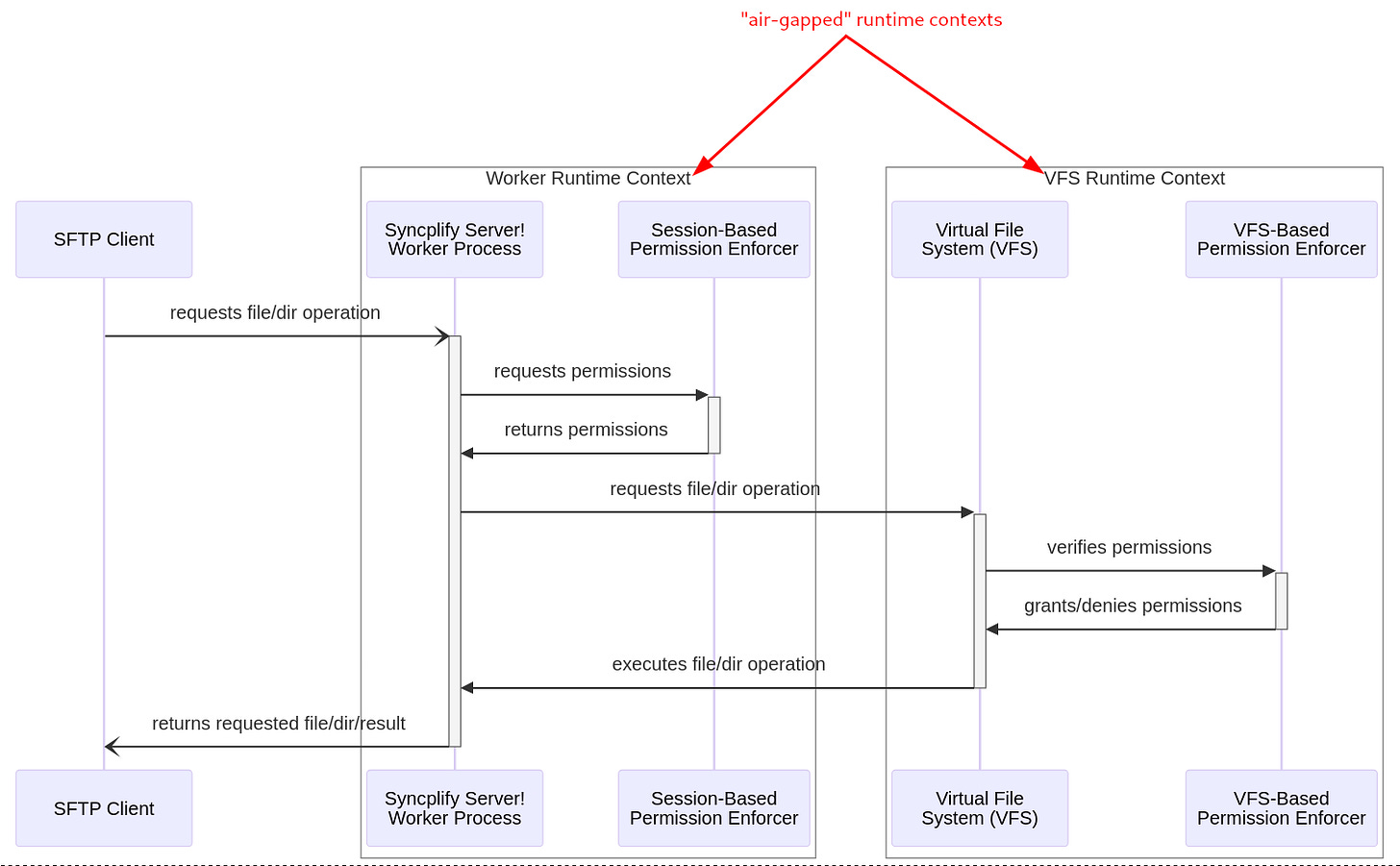 When a client requests a file/directory operation to Syncplify Server! V7, the request is first run through the Session-Based Permission Enforcer which runs in the same context as the protocol-handler in the worker process (just like in V1-V6) but then, after the request is handed over to the Virtual File System, the VFS itself carries out a second - 100% independent - permission check, which runs in a different and separate runtime context to which the connected session has absolutely no access.