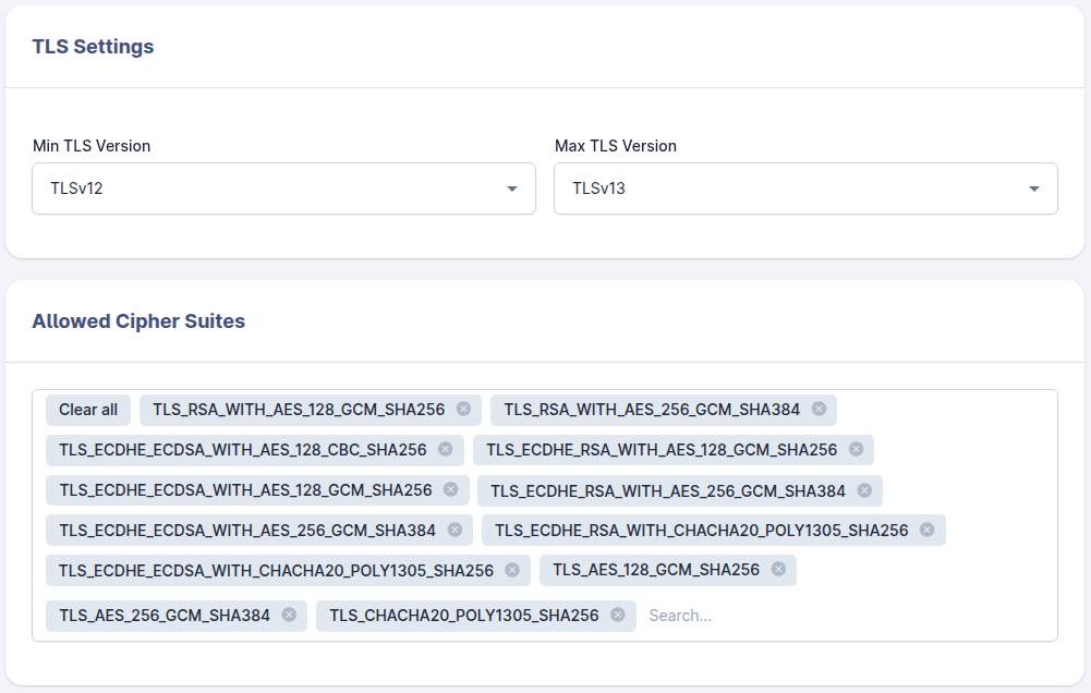The TLS settings used by and for the FTP(E/S) protocol handler are found in the Admin UI, under Security → FTP(E/S) → Advanced. Configure the following settings to achieve the above-mentioned security posture: